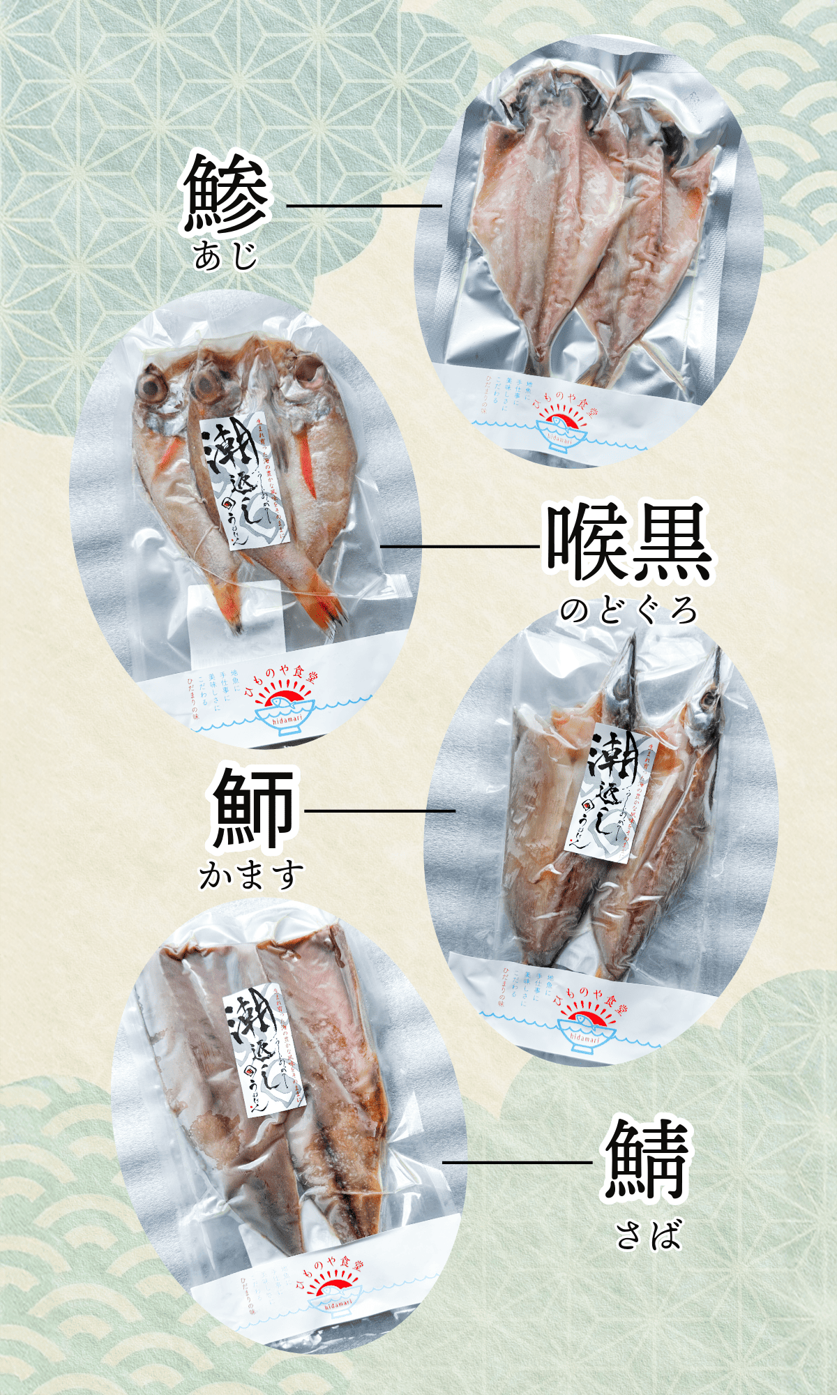 | 内容量 | のどぐろ・瀬つきあじ・カマス・塩さば一夜干しなどの中から、4種類の干物を各1袋(※1袋2枚入り)計4袋 魚種のご指定は承っておりませんので、あらかじめご了承ください。 |