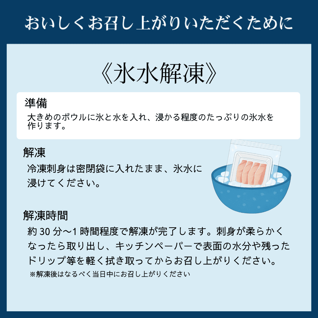 お刺身をより美味しく召し上がっていただくために、下記の手順で氷水解凍をおすすめしております。