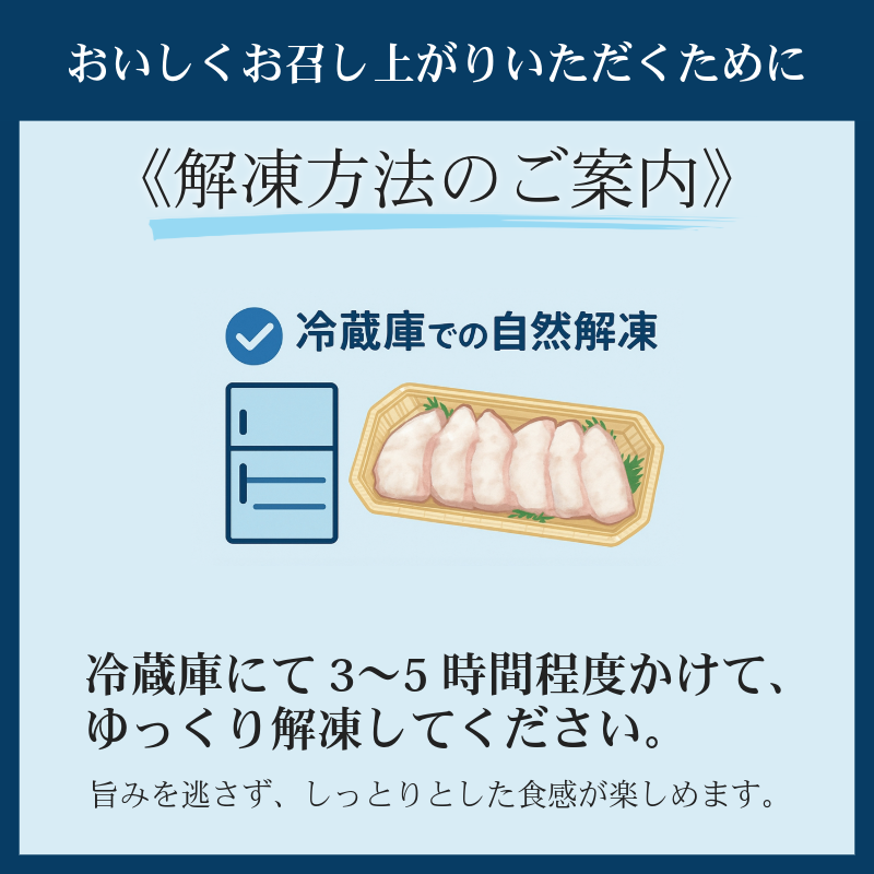 解凍方法によってドリップや臭みを抑え、より美味しくお召し上がりいただけますので、同封の「解凍ガイド」をご参考になさってください。